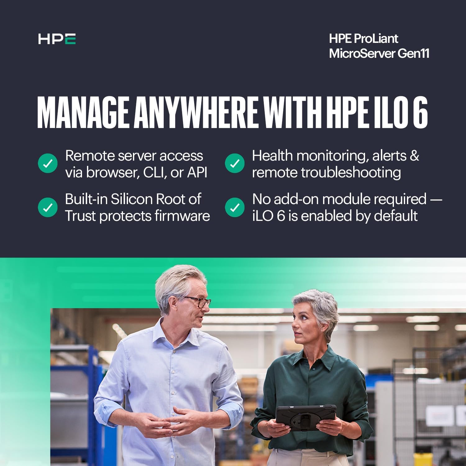 REMOTE MANAGEMENT READY: Includes HPE iLO6 with Silicon Root of Trust, TPM 2.0, and dedicated iLO-M.2 port kit for secure and efficient remote server administration