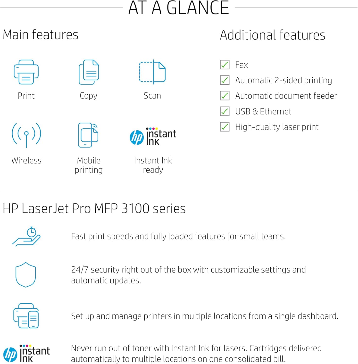This LaserJet Pro printer is built with powerful productivity features for small teams – fast speeds, built-in security, and cloud connectivity so you can setup and manage it from anywhere.HP Office Laser Multifunction Printers are designed for SMBs and small workteams in larger companies, delivering enhanced productivity, simplified workflows and reduced costs.This printer uses dynamic security, which may be updated periodically by firmware updates. The printer is intended to be used solely with cartridges using an original HP chip. Cartridges using a non-HP chip may not function or may cease to function. More at:www.hp.com/learn/ds Powerful productivity. Support your small workteams with this smart printer, designed for up to 7 users.Print more efficiently. Save time, paper, and costs with fast printing, scanning and auto two-sided printing.Do more in fewer steps. Simple shortcuts allow your employees to complete common tasks with just a touch.Get productivity in the palm of your hand. Print, scan, and save time with Shortcuts from HP Smart. Seamless management. Centralize print management for your enterprise. HP Web JetAdmin makes it easy with its suite of features.Set up your printer quickly wherever work happens. Cloud connectivity makes it easy for your IT team.Access your printers from a single dashboard. Smart Admin guides you through setup and gives IT visibility. Avoid interruptions with Wi-Fi® that intelligently looks for the best connection to stay on-line HP Wolf Pro Security. Get printer security out of the box. Preconfigured settings mean it’s ready when you are.Set up and manage your printers from a single dashboard. Smart Admin makes the experience seamless. Add a layer of security. PIN/pull option authenticates your print jobs only when you’re present.Set configuration policies and validate settings universally with HP JetAdvantage Security Manager. Hassle-free supplies management with Instant Ink for lasers. Enroll to save on Original HP Toner with Instant Ink. Get toner, delivery and recycling. Never run out of toner with Instant Ink for lasers. Cartridges are delivered automatically and only when you need it.Manage your subscription to get cartridges delivered to multiple locations on a single consolidated bill.With Instant Ink, you get to select the right plans for each of your printers. Change or cancel at any time.